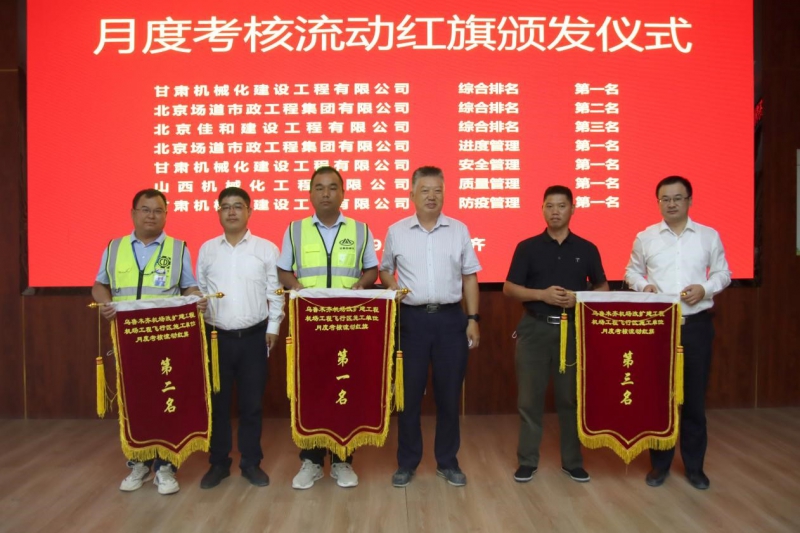 此次會議對施工單位八月份的相關工作進行了綜合考核,我司烏魯木齊機場項目經(jīng)理部在8家施工單位評比中獲得綜合第一名、安全第一名、防疫第一名的好成績,得到了業(yè)主方、擴建指揮部及監(jiān)理單位的一致認可。同時會議對九月份全場飛行區(qū)工程的相關工作進行了部署,下達了各標段施工任務。