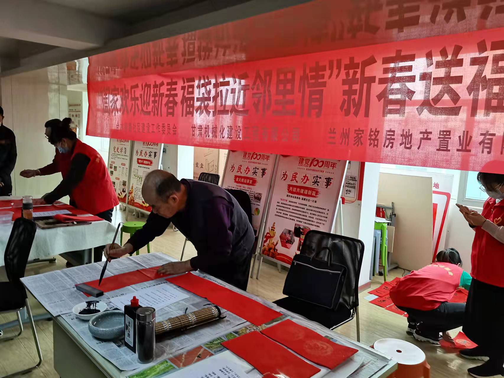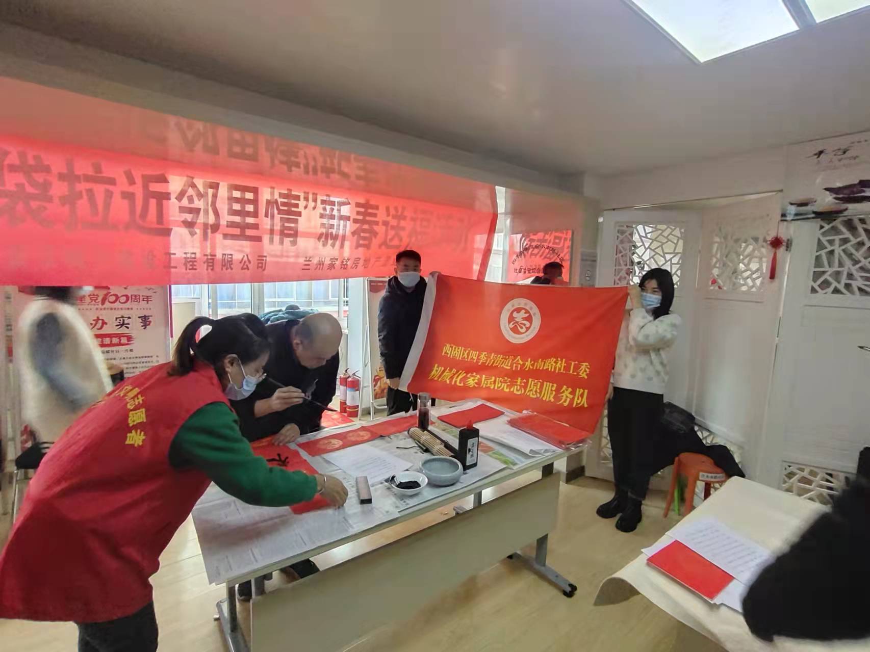 書法有行、隸、草等多種書法體,大家相互交流,相互學(xué)習(xí)。書法愛好者們將一副副飄著墨香的“?!弊炙偷骄用袷种?,同時(shí)也把祝福和溫暖送到每位居民的心坎上。