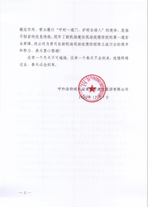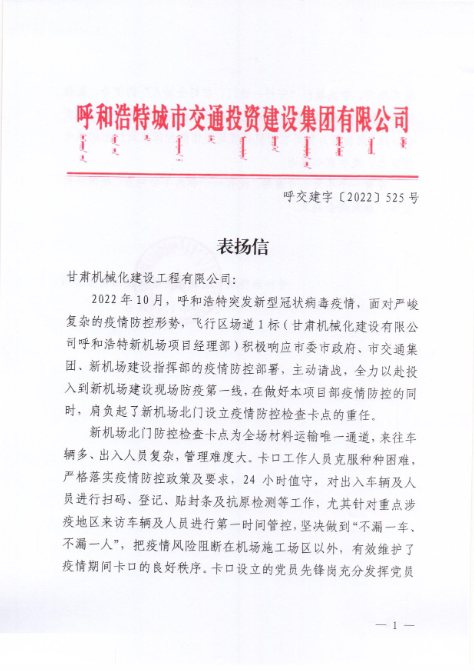 2022年12月7日,呼和浩特市交通投資建設(shè)集團(tuán)有限公司給我司發(fā)來表揚(yáng)信,表揚(yáng)信中充分肯定了我司呼和浩特新機(jī)場項(xiàng)目部在疫情防控工作上作出的努力,展現(xiàn)了我司的社會責(zé)任與擔(dān)當(dāng)。