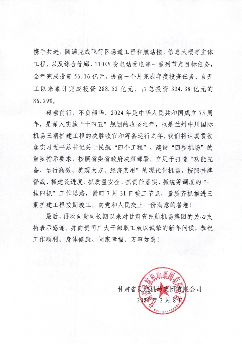最后,甘肅省民航機(jī)場集團(tuán)有限公司再次向我司長期以來對甘肅省民航機(jī)場集團(tuán)的關(guān)心支持表示感謝,并向我司廣大干部職工致以誠摯的新年問候!